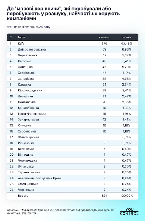 Майже половина “масових керівників”, які перебували чи перебувають у розшуку, керують компаніями у Києві — 370 бізнесів або 43% від загальної кількості.