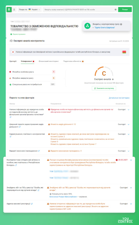 Під час перевірки 19 рекордсменів-бізнесменів у розшуку для 43 компаній спрацювали фактори обачності в аналітичній системі YouControl, що вказують на ймовірну пов’язаність з країною-агресором у минулому.