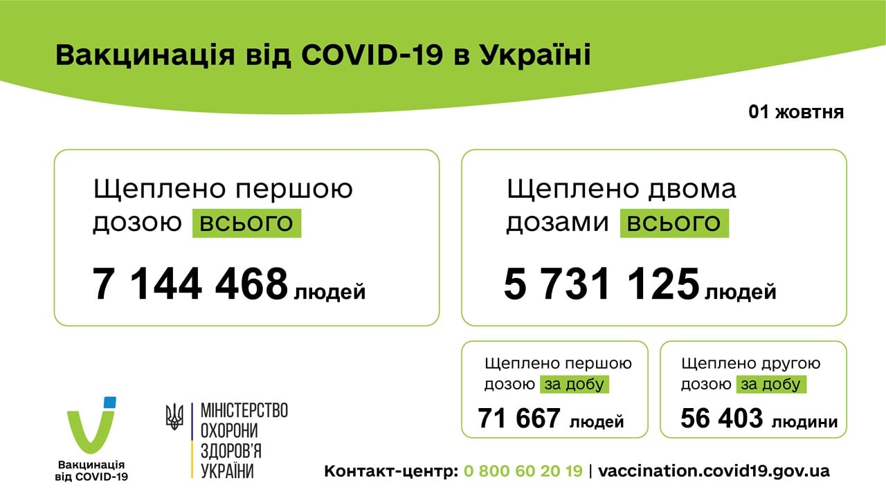 За минулу добу 128 070 людей вакциновано проти COVID-19. Одну дозу отримали 71 667 людей, повністю імунізовані - 56 403 людини.