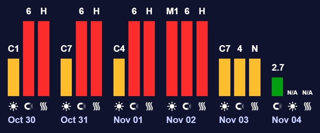 За даними NOAA, рівень Кp-індексу, що відображає силу збурень магнітного поля Землі, коливатиметься в межах від 3 до 5 балів. Лише після 11 листопада очікується поступове зниження активності. Нагадаємо, що значення Кp-індексу 5 і вище свідчить про початок магнітної бурі.