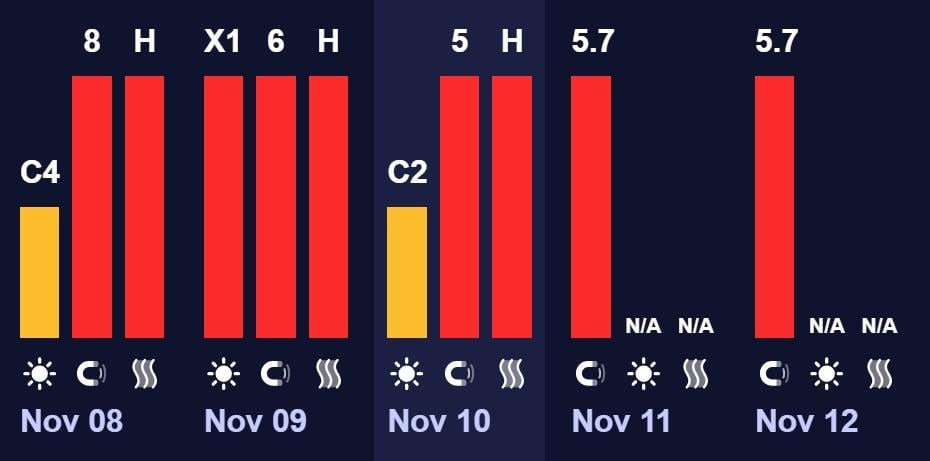 Крім того, на Землю продовжує впливати сонячний вітер, що утворився після спалаху, який стався 8 листопада. За прогнозами, підвищена сонячна активність збережеться до 11 листопада.