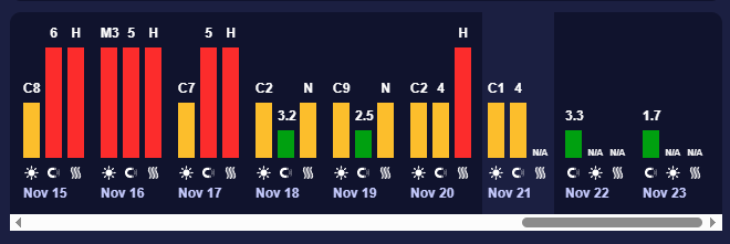 21 листопада. Очікується підвищена сонячна активність із К-індексом 4 (жовтий рівень) — це помірні коливання, які можуть впливати на чутливих людей.