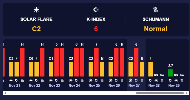 25 листопада магнітна активність досягла піку — 7 балів, після чого почала спадати. Проте навіть 27 листопада буря залишалася на рівні 6 балів, що свідчить про її високий потенціал впливу на організм. Очікується, що 28 листопада інтенсивність знизиться до 4 балів, а пізніше — до мінімальних значень.